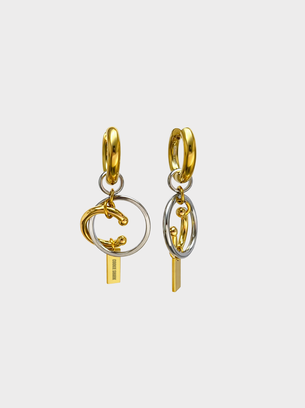 Boucles d'oreille mixtes doré/argenté composées d'anneaux ornement et charms articulés. Les différents éléments sont mobiles entre eux grâce aux anneaux de jonction.